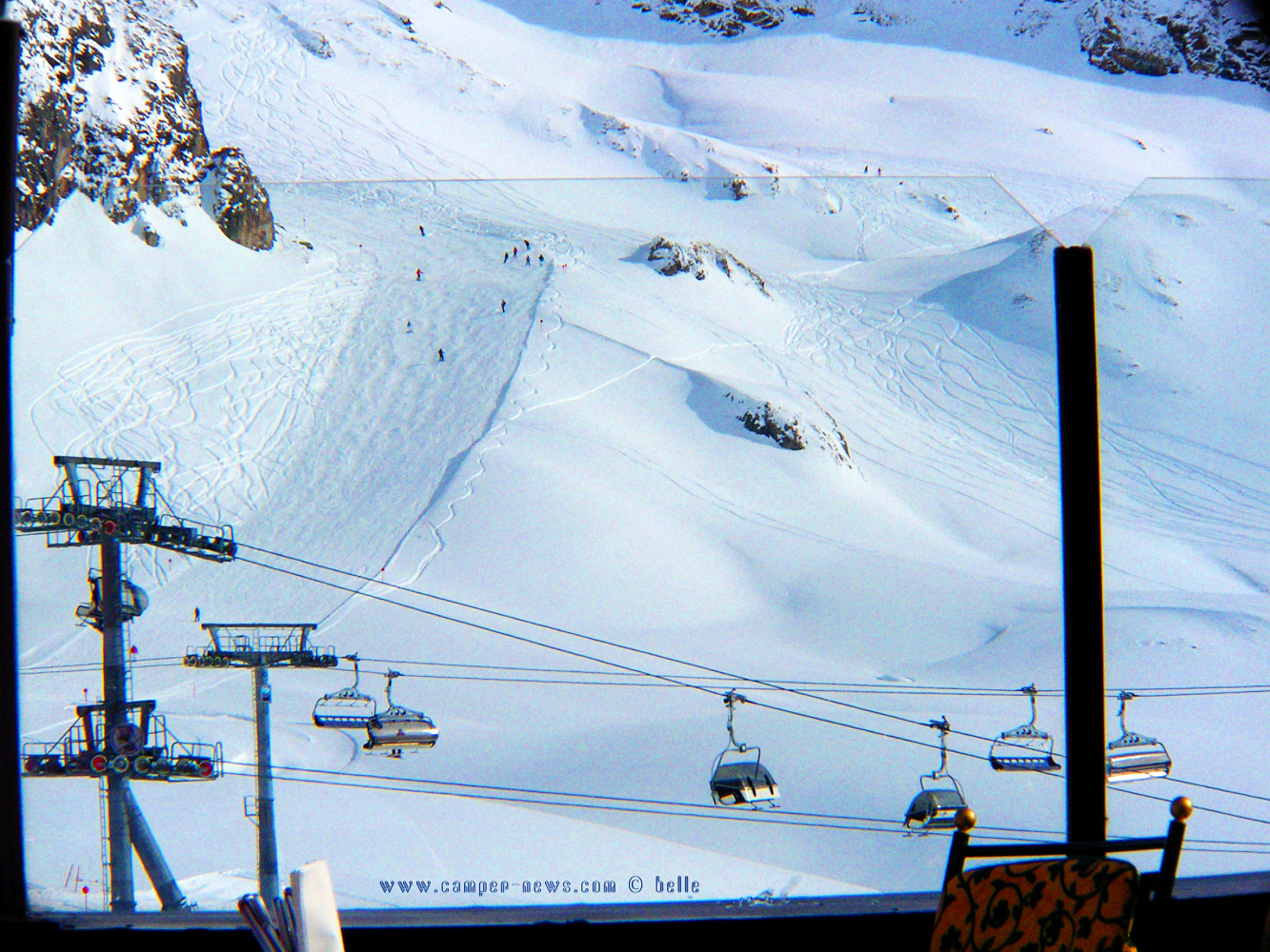 In Ischgl dann angekommen, ging es mit dem Lift nach oben. Julia und Peter schnallten sich die Skier an und brausten den Berg hinunter. Ich hatte irgendwie nicht mitbekommen, dass ich mit dem Lift wieder runter fahren soll, sondern wartete oben auf die beiden, dass sie wieder kommen, denn ich nahm lieber mit der Terrasse vorlieb und schaute den Skifahrern lieber nur zu. Hatte es ein Mal versucht und mehr Schnee gefressen, als mir lieb war – das war nix für mich!